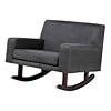 Nurseryworks Empire Rocker in Slate with Dark Legs: Baby. The result is a comfortable modernism with subtle connections to the past; pursuing values like, warmth, character, even sweetness... The Empire Rocker from Nurseryworks combines the principles and craft of mid-century California and Early American furniture. They‘ve combined the refined simplicity of Shaker and Federal style details from early America with the decorative thread and exuberance of mid-century California design. Simplifying some classic American details and adapted them to the contemporary lifestyle. Tufting, turned wood spindles and the wing-back all are a nod to our past, but updated in a playful modern way.