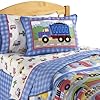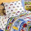 Olive Kids Under Construction Toddler Comforter Bed Set: Home & Kitchen. Machine wash comforter in cold on the delicate cycle, and tumble dry on low. Get everything you need to send your toddler to sleep with dreams of giant dump trucks with this Olive Kids Under Construction toddler bedding set. It includes a polyester-filled comforter and a complete sheet set (flat sheet, fitted sheet, and one pillowcase). The comforter features a mix of iconic construction vehicles set against a royal blue base and accented with individual vehicles accented by outline stitching to make them pop inch off the comforter. The sheets replicate these illustrations against a white background, and are finished with a circular design hem. Made from 100 percent cotton, the sheets have a comfy 210-thread-count while the comforter has a 180-thread-count. The Twin-sized comforter measures 42 by 58 inches, the flat sheet measures 48 by 70 inches, the fitted sheet measures 28 by 52 inches, and the pillowcase measures 30 by 20 inches. The sheets can be machine washed in warm.