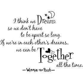 I think we dream so we dont have to be apart so long. If were in each others dreams, we can be together all the time. Winnie the Pooh wall art wall quote wall saying: Baby. Installation instructions are included for a simple, professional install in minutes. ****Size: 23x17''***** Wall sayings and designs are the latest trend in interior decorating and home decor. It is an easy and creative way to add personality and charm to Any Room! Vinyl Lettering is a creative way to transform any room into a stylish, unique space. By applying your favorite sayings directly to your walls you will create daily inspiration with a beautiful hand-painted look. ****Make sure you are purchasing from Epic Designs to ensure the highest quality and satisfaction.