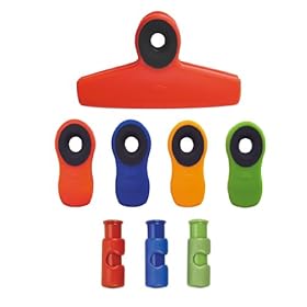 OXO Good Grips 8-Piece Clip Set: Kitchen & Dining. All Clips and Cinches feature sturdy plastic construction and soft, comfortable, non-slip touch points. Clip, seal, store, organize and display with efficiency and ease - and value. The OXO Good Grips 8 Piece Clip Set pairs two of our essential Clip styles with our convenient Bag Cinches. Four All-Purpose Clips are ideal for sealing bags, organizing papers, posting photos and more. Three Bag Cinches replace awkward, easy-to-lose bread tags and twist ties. One Large Bag Clip features an extra-wide mouth for sealing oversized bulk items like chips, pet food and more. All-Purpose Clips and Bag Clip both have rear magnets to post artwork, notes and photos on any magnetic surface and hanging holes to mount clips on hooks, nails and string. Non-slip mouths grip items securely but gently.