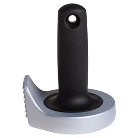 OXO Good Grips Meat Pounder: Kitchen & Dining. The entire head employs a nonstick coating so meat fibers and juices clean off easily. OXO's i-series meat pounder flattens or tenderizes boneless cuts of meat and poultry for use in marinades, sautés, and tender baked dishes, and is specially designed to absorb the impact of hammering so your hand stays comfortable throughout. This meat pounder features pyramid-shaped teeth and a cushioned handle with a unique nonslip grip. Use the side with the pyramid teeth for tenderizing, or use the pounder's smooth top to efficiently flatten meats. The pounder weighs a robust 24 ounces--enough to do most of the work but not enough to tire you out--and is dishwasher-safe.