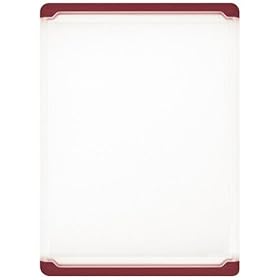 OXO Good Grips 10-1/2-by-14.5-Inch Utility Cutting Board, Red Edge: Kitchen & Dining. Measuring 10-1/2 inches by 15 inches, this versatile size handles medium to large jobs. Quality kitchen tools can easily turn tedious meal preparation into a fun culinary experience. OXO's Good Grips utility cutting board has all the makings of a top-notch cook's aid. Crafted from thick polypropylene, the surface is durable, nonporous, and odor resistant; it is also impervious to deep scratches and maintains the sharp edges on kitchen knives. A juice groove around the perimeter of one side keeps liquids contained, and soft handles at either end make it easy to transport and keep it from slipping on the counter. The cutting board is designed to be used on both sides, doubling a cook's work capacity without adding bulk. It is available in a range of handle colors and goes safely into the dishwasher between uses.