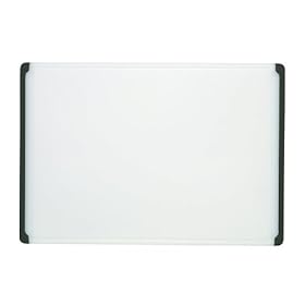 OXO Good Grips 15-inch by 21-Inch Cutting Board, Black Edge: Kitchen & Dining. Measuring 15 by 21 inches, the piece is white with black edges. Thanks to great materials and a smart design, this cutting and carving board from OXO makes prepwork faster, safer, and easier to clean up. Created from a thick piece of nonporous and odor-resistant polypropylene, the board features hand-friendly tapered grips that serve the dual purpose of slip-resistance. And, because both sides are designed for chopping, you can slice raw chicken on one side then flip it over to dice onions on the other without cross-contamination. Knives like this cutting board, too, because it maintains sharp edges while resisting deep scratches. A helpful juice groove keeps liquids off the countertop, and the whole board goes in the dishwasher for convenient cleanup. Two smaller versions are also available.