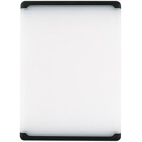 OXO Good Grips 10-1/2-by-15-Inch Utility Cutting Board, Black Edge: Kitchen & Dining. Measuring 10-1/2 inches by 15 inches, this versatile size handles medium to large jobs. Quality kitchen tools can easily turn tedious meal preparation into a fun culinary experience. OXO's Good Grips utility cutting board has all the makings of a top-notch cook's aid. Crafted from thick polypropylene, the surface is durable, nonporous, and odor resistant; it is also impervious to deep scratches and maintains the sharp edges on kitchen knives. A juice groove around the perimeter of one side keeps liquids contained, and soft handles at either end make it easy to transport and keep it from slipping on the counter. The cutting board is designed to be used on both sides, doubling a cook's work capacity without adding bulk. It is available in a range of handle colors and goes safely into the dishwasher between uses.