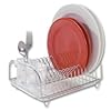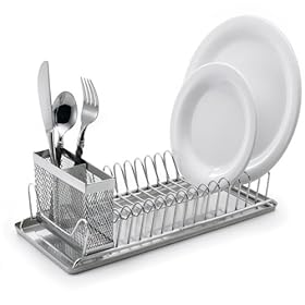 Polder 6115-75 Compact Stainless-Steel Dish Rack with Utensil Holder: Home & Kitchen. Even more, the dish rack features a two-slot mesh cutlery basket, which can be removed and carried to the silverware drawer for convenience when putting away dry forks, spoons, knives, and other utensils. Narrow enough to fit smaller sinks yet roomy enough to accommodate up to 14 plates, saucers, or a host of other freshly washed dishes, this compact dish rack unites style with function to expert results. The unit's 18/8-grade stainless-steel construction resists corrosion even under continually damp circumstances, which in turn protects dishes and glassware from transferred rust or discoloration. Finally, an included stainless-steel drip-tray with side rims neatly collects water run-off, preventing it from pooling on countertops and dripping onto the floor.