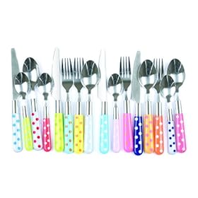 Present time Assorted Colors Polka Dots Cutlery Set, 16-Piece: Kitchen & Dining. This stainless steel cutlery set features multicolored plastic handles decorated with polka dots. Perfect for summer barbecues, festive parties or everyday use. Sixteen piece set includes 4 each of knives, forks, dinner spoons and teaspoons.
