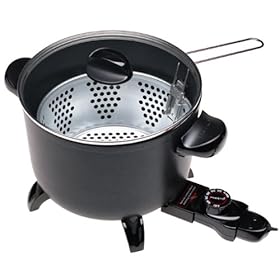 Presto 06000 Kitchen Kettle Multi-Cooker: Kitchen & Dining. For best results, wash the pot before first use and season with cooking oil. Made of heavy cast aluminum with a nonstick surface inside and out, this multipurpose cooker with lift-and-drain basket simmers soups and stews, browns and roasts meats, boils corn on the cob and other vegetables, steams fish and rice, and deep fries shrimp and other foods. And in addition to its everyday versatility, the cooker can be washed in the dishwasher after simply removing the heat control. The glass lid is also dishwasher-safe. For safety, the cooker comes with a short 30-inch cord with a magnetic coupler that attaches to the heat control; if jostled, the cord detaches at the magnetized point to help prevent the kettle from being overturned. An easy-turn knob on the heat control adjusts the cooking temperature from warm to 400 degrees Fahrenheit. Two large handles make the cooker easy to lift, and four sturdy legs keep the heat off the countertop. The cooker measures 9 inches in diameter and stands 7-1/2 inches tall. Presto covers the cooker with a two-year warranty.