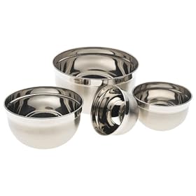 Prime Pacific Euro Stainless Steel Mixing Bowls, Set of 4: Kitchen & Dining. The four-piece set includes 1, 1.5, 3, and 5-quart bowls which nest for easy storage. This heavy-duty 18/0 stainless steel mixing bowl set from Prime Pacific features timeless European styling and easy care. A polished band tops the matte outside finish of each bowl while the inside features a gleaming mirrored finish.