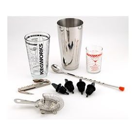 Pro Bartender Cocktail Mixing Set: Kitchen & Dining. (4) Liquor bottle pourers. Every home bar needs a Pro Bartender Mixing Set! Comes complete with everything you need. Makes a great gift item. In stock and ready to ship. Includes: (1) Stainless steel shaker. (1) Stainless steel strainer. (1) KegWorks Glass Cocktail Measuring Beaker. (1) Long metal stirrer. (1) Heavy duty combination bottle opener & cork puller.