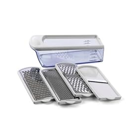 Progressive International HG-85 6-Piece Grater Set: Kitchen & Dining. Non-skid feet keep the container securely in place when in use, and food can be stored in the container for later--no need to dirty a second dish. A handy tool to have on hand, this six-piece grater set by Progressive makes easy work of a variety of everyday food-prep tasks. The versatile unit provides a durable plastic frame, a 3-cup-capacity measuring container, and four interchangeable blade inserts. Switch out one blade insert for another to shred, slice, grate, or zest. Use the grater set for anything from shredding cheese to add to a homemade pizza to slicing veggies for a salad, grating chocolate for a dessert, or zesting lemons and limes for baked goods and more. The pieces clean up easily by hand or in the dishwasher, and the inserts fit inside the measuring container for compact storage.