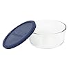 Pyrex 6010170 Storage 6-Piece Round Set, Clear with Blue Lids: Kitchen & Dining. Rectangular pieces are also available, and all are safe in the dishwasher for easy cleanup. Durable and nice-looking, Pyrex Storage pieces offer a welcome alternative to a cupboard full of plasticware. Made from strong, clear glass, the dishes are great for leftovers, ingredients, or prepared food. They store comfortably in the fridge, warm up in the microwave, and look a lot better than beat-up old plastic pieces at the table. For the storage line, Pyrex combines dark blue plastic lids with its reliable glass construction, adding versatility and stackability to the design. This 6-piece set includes three round dishes--2 cups, 4 cups, and 7 cups--and matching lids. --Emily Bedard What's in the Box Storage set, consisting of: 2-cup round dish; 4-cup round dish; 7-cup round dish; 3 lids.