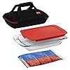 Pyrex Portables Baking Dish with Insulated Carrier, Clear with Black Carrier: Kitchen & Dining. No fuss, no spills, no bother. Pyrex Portables 4-piece set includes 1-each 9 by 13 by 2-inch sculptured rectangular dish, 1-each 9 by 13-inch-water blue plastic cover, 1-each hot pack, and 1-each water blue insulated carrier. Pyrex Portables food transportation system includes an insulated bag and hot and cold packs ideally suited to fit informal and mobile lifestyles. Pyrex Portables allow busy, on-the-go consumers to take their favorite meal wherever they go (hot or cold) sealed in the dish it was cooked in. There's no substitute for Pyrex, the original glass bakeware.