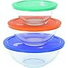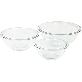 Pyrex Prepware 3-Piece Mixing Bowl Set, Clear: Kitchen & Dining. The set costs less than your average music CD--not a bad deal considering the quality--and, if you're moderately careful, it will last you a lifetime. Glass is one of the best materials there is for mixing and storing food. Why? Because it doesn't pick up odors or tastes and so doesn't transfer any extra inch taste to your foods. Pyrex glass is especially desirable, as it's constructed to be durable and is safe to use in the oven, microwave, freezer, and dishwasher. Pyrex has been making quality glass products for the better part of a century--this company pioneered heat- and cold-resistant glassware--so when it comes to glass, they know whereof they speak. Keep wet and dry ingredients separated in these three bowls while you mix and bake, then store leftover cookie dough in one of them when you're done. Bowls stack for easy storage.