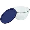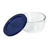Pyrex Storage 2-Cup Round Dish, Clear with Blue Lid: Kitchen & Dining. The durability of Pyrex Storage allows stacking for efficient space utilization. Pyrex Storage 2-cup round dish with lid includes 1-each 2-cup round dish with dark blue plastic cover. Pyrex Storage products come with seal tight plastic lids for secure food storage. They are designed for reheating leftovers and convenient refrigerator storage. There's no substitute for Pyrex, the original glass bakeware.