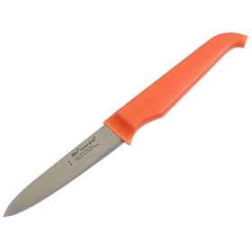 Furi Rachael Ray 4-Inch Paring Knife with Blade Guard: Kitchen & Dining. A match for the Gusto-Grip chef's and santoku knives, the parer carries a limited lifetime warranty and is best washed by hand. Created by Füri in cooperation with celebrity chef Rachael Ray, the Gusto-Grip line of knives are well-made, user-friendly, and fun to look at as a bonus. Designed to retain sharpness and maximize efficiency on the cutting board, Gusto-Grips blades are fashioned from a single forged piece of premium CrMoV German stainless steel. The nonslip polypropylene and rubber handles in cheerful bright orange have a comfortable reverse wedge shape that minimizes the need for squeezing and molds ergonomically to the hand. A smart touch, antimicrobial protection on the grip limits bacteria, mold, and deterioration. A great little tool, this Gusto-Grip paring knife has a versatile 4-inch blade suited to trimming eyes from potatoes or slicing nectarines. The finger notch creates greater control, and the piece comes with a blade guard that is especially handy in the picnic basket or lunchbox. A 3-1/2-inch Gusto-Grip parer is also available.