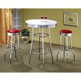 3pcs Retro Style Red & Chrome Bar Table & 2 Stools Set: Home & Kitchen. The tubular steel frame of the item is plated with chrome and constructed with quality. You will receive a total of 1 Bar Table and 2 Bar Stools. Bar Table: 30Dia x 41.75H Bar Stool: 14.25Dia x 29H Finish: Red, Silver and White Material: Metal and Vinyl 3pcs Retro Style Red & Chrome Bar Table & 2 Stools Set Item features Chrome Plating and Red Vinyl Covered Cushioned Seat. This item is modeled after the famous style of the American 1950's Diner that has served so many back in the days. Its smooth, strong, and durable surfaces make it easy to clean and hassle free.