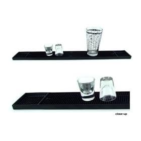 Rubber Bar Service Spill Mat - BLACK: Kitchen & Dining. Features: Made of thick, heavy black rubber. This gripping bar mat will keep a hold on your wet glasses to avoid spilling and protect your bar's surface. It also provides easy drainage on both ends. Using this mat will significantly cut down on your cleaning time! In stock and ready to ship. Specs: Dimensions: 3 1/4W x 5/8H x 27L.