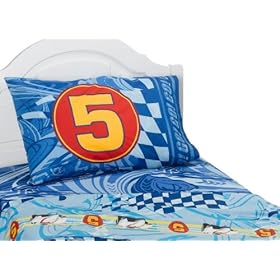 Speed Racer Speed Twin Sheet Set: Home & Kitchen. They feature a swirling melange of roadways and checkered flags on a blue ground, and the pillowcase includes a large-scale illustration of Speed's Mach 5 race car that reverses to the Mach 5 logo in red. Relive the exciting race action from the Speed Racer movie with this complete set of sheets for Twin beds from the Speed Racer bedding collection. This set includes one fitted sheet, one flat sheet, and one standard-sized pillowcase. They're made from 60 percent cotton/40 percent polyester with a 132-thread-count.