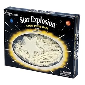 Star Explosion Glow In The Dark: Toys & Games. The stickers and plastic shapes are made of Glominite, a safety-tested product that stores light. This Star Explosion kit allows children to create a universe in their own bedrooms. With over 500 glow-in-the-dark adhesive pieces to choose from (including stars of all sizes, comets, asteroids, and spiral galaxies), junior astronomers can create star displays, black-hole effects, and, with the aid of the included star map, actual constellations. There are 364 small (.25-inch to 1.5-inch) star stickers and about 200 larger (1.5-inch to 5.5-inch) plastic shapes that adhere to walls and ceilings with the putty that comes with the set (it's safe to use on most surfaces). Each time the Glominite shapes are exposed to light, they recharge--so that the glowing keeps on going.