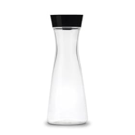Takeya 360-Degree 33-3/4-Ounce Carafe, Black/White: Kitchen & Dining. The airtight twist-top lid opens with a 1/4 turn, revealing a drip-free pour spout that can be used from any angle. Perfect for storing and serving water, juice or wine, this Takeya 360-degree carafe features a fresh design with a clear AcraGlass body that is BPA-free, as well as stain and odor proof. AcraGlass is lightweight and features glass-like clarity, yet is more durable than glass. This attractive and highly functional carafe holds 33-3/4-ounce, and the lid is leak-proof and locks in freshness.