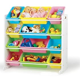 Tot Tutors Toy Organizer Storage Bins, Pastel: Home & Kitchen. Empty of toys, it weighs 21 pounds. De-clutter the play area or a child’s bedroom with this bright and playful toy organizer from the folks at Tot Tutors. Unlike a conventional toy box, the organizer’s bins separate the dolls from the blocks and the blocks from stuffies, while the rack’s angled shelving presents all 12 bins at once so access is easy for both toddlers and parents. The organizer’s bins come in a variety of cheerful pastel hues and are easy to lift in and out, making cleanup and toy transportation convenient. Built of solid wood materials, the rack features a sturdy wide base as well as handhold cutouts for comfortably lifting and transporting the entire unit. Fully assembled, it stands 34 inches tall by 31 inches wide by 11 inches deep. Recommended for kids three or older, the organizer comes with a total of eight square and four rectangular bins.