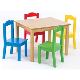 Tot Tutors Kids inch Table and 4-Chair Set, Primary Wood: Home & Kitchen. Upon delivery, some assembly is required. Perfect for coloring pictures of dinosaurs or practicing the ABCs, this kids’ table and chair set from Tot Tutors makes a great addition to any kid’s room. The set comprises of one rectangular table and four chairs. Designed for children ages three and older, the chairs’ 10-inch seat heights enable toddlers to sit down and get up with ease. The set benefits from sturdy wood construction. For a classic look, the table features a natural finish while the chairs are painted in fun primary colors. The gender-neutral set includes one red chair, one blue chair, one yellow chair, and one green chair. To clean the furniture, wipe pieces down with a soft damp cloth and dry. Avoid using permanent markers and paints at the table to preserve its veneer. Tot Tutors offers kids’ table and chair sets in pastel and espresso colors, in Mission style, and in plastic.