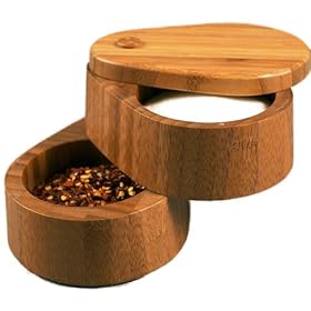 Totally Bamboo Double Salt Box: Kitchen & Dining. And, because it's harder than wood, bamboo won't absorb water, crack, or peel, and can be sanded if need be. Fast-growing in nature, bamboo is also fast-growing in popularity as one of the best renewable resources available. Totally Bamboo prides itself on using only hand-selected, China-grown moso inch bamboo, which is not a food source or habitat for the giant panda, and which grows to harvestable size in just 3 to 5 years. Totally Bamboo follows strict environmental guidelines for processing and fair labor policies for its workers. And, the toxin-free products contain no dyes, stains, or glues containing formaldehyde. This double-section bamboo box attractively stores different types of sea salt, spices, or what-have-you, on the kitchen counter or right on the table. You can even use it for holding jewelry on a dresser. The lid and sections pivot around a central stem a full 360 degrees for easy access. Along with natural variations in color, an oven-heating process caramelizes the natural sugars in the bamboo and produces the warm honey tone of the box. When necessary, simply wash the box lightly with warm, soapy water, and wipe now and then with mineral oil.