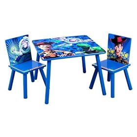 Toy Story Table and Chair Set: Toys & Games. Perfect for studying, homework, art projects, meal time and more. The Disney Pixar Toy Story Table and Chair Set is a the perfect place to sit and ponder, color, eat or just be. It's functional design and sturdy construction ensure that countless art sessions and so much more can be enjoyed with style and fun. It comes with two chairs. Some assembly required.