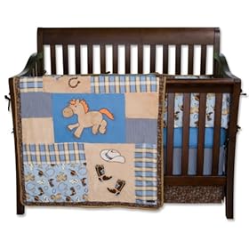 Trend Lab Cowboy Baby 4 Piece Crib Bedding Set: Baby. Box pleat crib skirt with 15 inch drop features awesome bandana print and classic pinstripe in blue and chocolate brown. Your cowboy baby will love sleeping with his pony, boots, and hat. Trend Lab's cowboy baby 4 piece crib bedding set features fabulous embroidered cowboy motif appliques that are mixed with a delightful scatter print. The quilt is framed with a chocolate based blue and tan bandana print, and accented with a classic blue and chocolate pinstripe. The scatter print color accents include chocolate brown, desert tan, and dashes of burnt orange. A soft rope-like trim adds western detail to the quilt and bumper. The brilliant mixture of soft cotton fabrics combined with cuddly velour help your little cowboy baby sleep soundly through the night. The quilt measures 35 inch x 45 inch and features cowboy themed embroidered appliques set against soft caramel velour and dusk blue cotton. Patches of a bold chocolate bandana print, cowboy themed scatter print and classic stripe and motif appliqués mixed with bold bandana, plaid and motif prints in blues, browns and tans with splashes of burnt orange. Soft tan velour and classic blue pinstripe cotton twill add great texture and dimension. Rope trimmed four piece bumper set features embroidered pony and lasso appliqué mixed with cowboy motif and bandana prints. Fitted crib sheet in lovely blue cotton features deluxe 10 inch deep pockets with sturdy elastic surrounding the entire opening for a more secure fit.