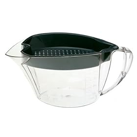 Trudeau 0991105 Gravy/Fat Separator: Kitchen & Dining. The complete gravy separator is covered by a five-year warranty. Create rich and flavorful gravy without excessive fat or gristle, with this simple gravy separator from Trudeau. It holds up to 4 cups of liquid. To use, simply pour gravy direct from the frying pan into the separator through a fitted strainer. Undesired fat, gristle, and debris are filtered out for disposal, leaving smooth, delicious gravy in the pitcher for topping roasts and mashed potatoes. The pitcher has a wide mouth and pouring spout for instant serving, and a roomy handle for easy maneuvering. Its sturdy construction resists heat up to 400 degrees Fahrenheit. In addition, the pitcher is microwave- safe and can be placed in the dishwasher along with the strainer. It measures 10-1/4 by 5-3/8 inches, stands 5 inches high, and weighs 1 pound upon shipping.