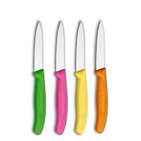 Victorinox Swiss Classic 4-Piece Paring Knife Set: Kitchen & Dining. These knives have renowned sharpness, and are hand made in Switzerland. The new Swiss Classic collection Victorinox Swiss Army has been making legendary Swiss Army Knives since 1897. Guess what we made before that. When Karl Elsener created the first Swiss Army Knife, he had no idea that he had just invented the symbol of Swiss ingenuity for generations to come. As a Master Cutler, he was only doing what came naturally. Karl had opened his cutlery factory 13 years before in Ibach, a village in northern Switzerland. By the time he dreamed up the world's first pocket tool, his cutlery business was already booming. As it was then, Cutlery by Victorinox Swiss Army is today the first choice of professionals right down the line - as ubiquitous in the bustling meat-packing plants of the Midwest as it is in the gleaming, four-star restaurant kitchens of Midtown Manhattan. You don't have to be a professional to appreciate our beautifully balanced, perfectly weighted, razor-sharp tools. But you can now put them to work just the same. Victorinox Swiss Army has been handcrafting the finest blades since 1884. 7-Inch Blade Granton Edge 6-Inch Blade Narrow Flex 10-1/4-Inch Blade, Serrated 10-1/4-Inch Blade, Granton Edge Victorinox Swiss Army's Superior Blades Mirrored polish finish on high-carbon stainless steel blade Laser tested for world-renowned sharpness and edge retention Blades are conically ground for ease of cutting and won�t discolor or corrode Holds a 56 HRC (Rockwell hardness) Features & Benefits of the Swiss Classic Collection New contemporary handle is inspired by our professional Fibrox Pro handle Lightweight, balanced and perfect for the home kitchen Handles are made from Fibrox-a patented material that is durable, ergonomically designed to fit the hand, slip resistant and hygienic The entire collection is NSF (National Sanitary Foundation)approved Trusted by Professionals for Generations. Now Available for the Home Chef. Our Swiss Classic Collection incorporates a new contemporary, more ergonomic handle with our traditional commercial-grade blade. The entire collection is made to the highest sanitary standards, earning the NSF (National Sanitary Foundation) seal of approval. Victorinox Swiss Army Cutlery features a Mirrored Polish Finish on High Carbon Stainless Steel Blades. The slip resistant handle is hygenic and dishwasher safe.