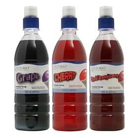 Victorio 3-Flavor Pack Shaved Ice/Snow Cone Syrups, Grape, Cherry, Red Raspberry: Kitchen & Dining. Perfect for snow cones, shaved ice, slushies and other frozen treats. Three popular Victorio syrup flavors (Grape, Cherry, Red Raspberry) now in one convenient 3-pack. 16-fluid ounces.