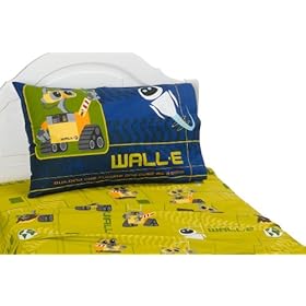 Wall-E Squares Twin Sheet Set: Home & Kitchen. The pillowcase features a blue ground with illustrations of Wall-E and Eve. Help your child make tracks to a restful night's sleep with this complete set of sheets for Twin beds from the Wall-E Squares bedding collection, which brings together the stubborn little robot and his friend Eve from the Disney/Pixar animated classic. This set includes one fitted sheet, one flat sheet, and one standard-sized pillowcase. Continuing with the color motif of the illustrated boxes from the collection's comforter, the sheets have a green base with illustrations of both Wall-E and Eve, building the future one cube at a time. They're made from 60 percent cotton/40 percent polyester with a 180-thread-count.