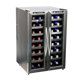 Whynter WC-321DD 32 Bottle Dual Temperature Zone Wine Cooler, Stainless Steel Trimmed Glass Door with Black Cabinet: Appliances. It allows for 32 bottles of wine storage capacity, 16 bottles in the right zone and 16 bottles in the left zone with vibration-free thermoelectric cooling. This Whynter Dual Temperature Zone Wine Cooler offers premium quality and sophisticated design. With the thermoelectric system, your wine is kept at the appropriate temperature and humidity levels without damaging vibrations.