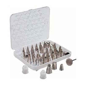 Wilton 2104-7778 Master Tip Set: Kitchen & Dining. The angled coupler assists in certain decorating operations, and a standard coupler plus two flower nails for creating roses are included. With more than 50 tips included in this professional-quality cake decorating set, your imagination is the limit. Garlands, rosettes, stars, flower petals--if you can dream it up there's a tip designed for the job. The set comes packaged in a white plastic storage tray to keep tips and tools organized in a drawer.