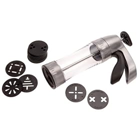 Wilton Cookie Pro Ultra II Cookie Press: Kitchen & Dining. Sixteen disks with different shapes and four mini-shapes are included, along with an instruction and recipe booklet. The quickest way to make uniformly perfect butter cookies, known as spritz in the Scandinavian tradition, is with a cookie press. Especially during the holidays, spritz cookies become a family's favorite in such shapes as Christmas trees or snowflakes. The Wilton Pro Ultra II Deluxe has several advantages over other models. The clear barrel allows monitoring of the dough level inside, while the ergonomic, soft-grip trigger is a big improvement over uncomfortable metal handles, especially when multiple batches are made over the course of many hours. And, a non-slip ring on the bottom keeps the press upright on a cookie sheet without sliding around. To use the cookie press, insert a shape disk, fill with room-temperature dough that is neither too soft nor too hard, and tighten the plunger rod. One squeeze of the trigger is usually enough to form a cookie. After use, the press should be washed by hand in hot, soapy water and allowed to dry thoroughly before storing.