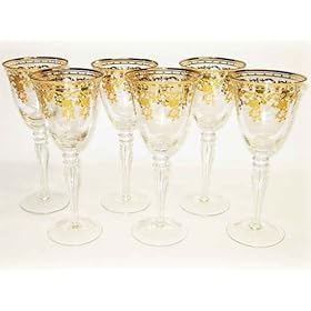 Wine Glasses with 14 Karat Gold Pattern - Made of Finest Three Star Glass - Set of 6 Wine Glasses: Kitchen & Dining. Wine Glasses feature key pattern frosted with 14 karat gold. Three Star Wine Glasses - add a touch of elegance to your drinking experience. Serve and drink in style with in a set of handcrafted fine Three Star glass. Glassware is perfect for serving Red Wine, white wine, water or other drinks to accompany fine dining or social gatherings in your kitchen or bar.