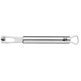 WMF Profi Plus Fruit Carver/Channel Knife: Kitchen & Dining. Contemporary European in style. A perfect tool for fruit carving, garnishing, and making citrus twists at the bar, this WMF Profi Plus Fruit Carver/Channel Knife features a unique design. It's groove, deeper than a traditional zester, allows for creating the perfect lemon twist that includes just the proper amount of pith to make the twist substantial, resulting in a twist that actually twists, and one that won't crumble in the cocktail. This cheese tool is beautifully balanced and features 18/10 stainless steel construction with a satin-finish, a cylindrical handle with convenient hanging loop.