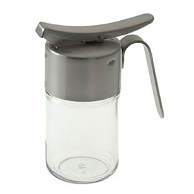 WMF Satin Steel and Glass Syrup/Honey Dispenser: Kitchen & Dining. The dispenser holds about 1 cup, stands 5-1/2 inches high, has a plastic gasket beneath the top for a tight seal, and (except for the gasket) is dishwasher-safe. With a heavy glass bottom and a handsome satin-finish 18/10 stainless-steel top, this syrup/honey dispenser has a quality feel. Pressing a thumb on its stout spring-loaded lever opens the spout. If you'd like a matching set, WMF also makes a sugar dispenser, creamer, and cocoa/cinnamon shaker.
